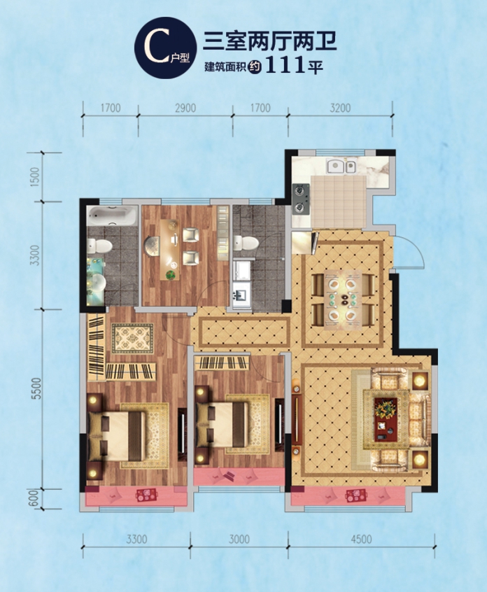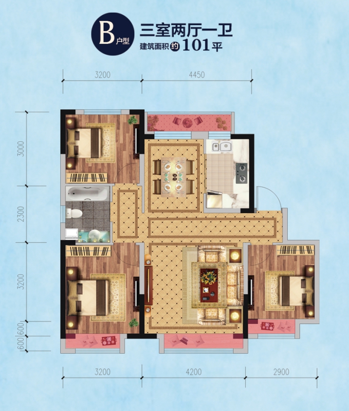 户型方正实用,动静分离,各成一派; 餐厅、客厅衔接有致,透光性好; 完善人性化设计,得房率高; 宽敞双飘窗设计,法式美景一览无余。